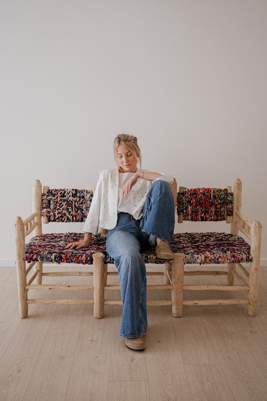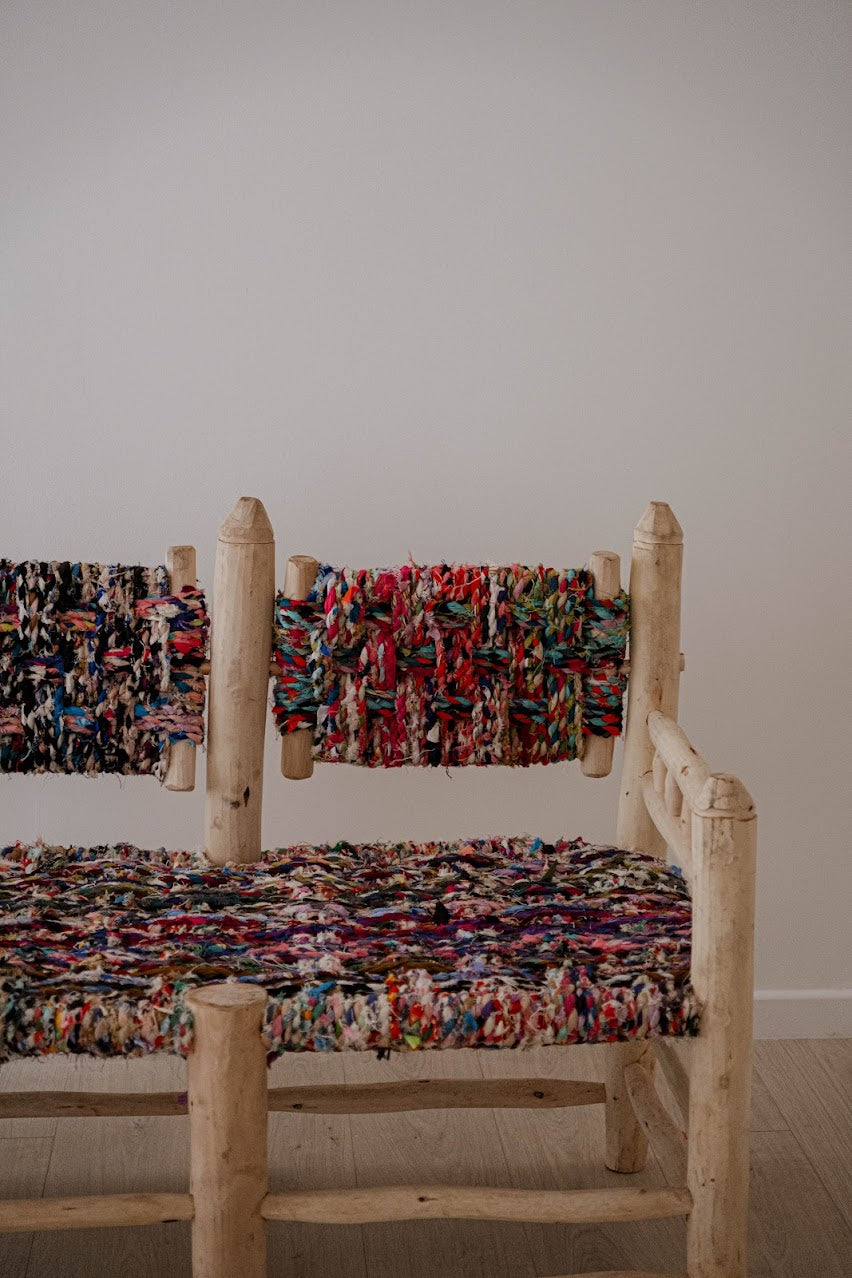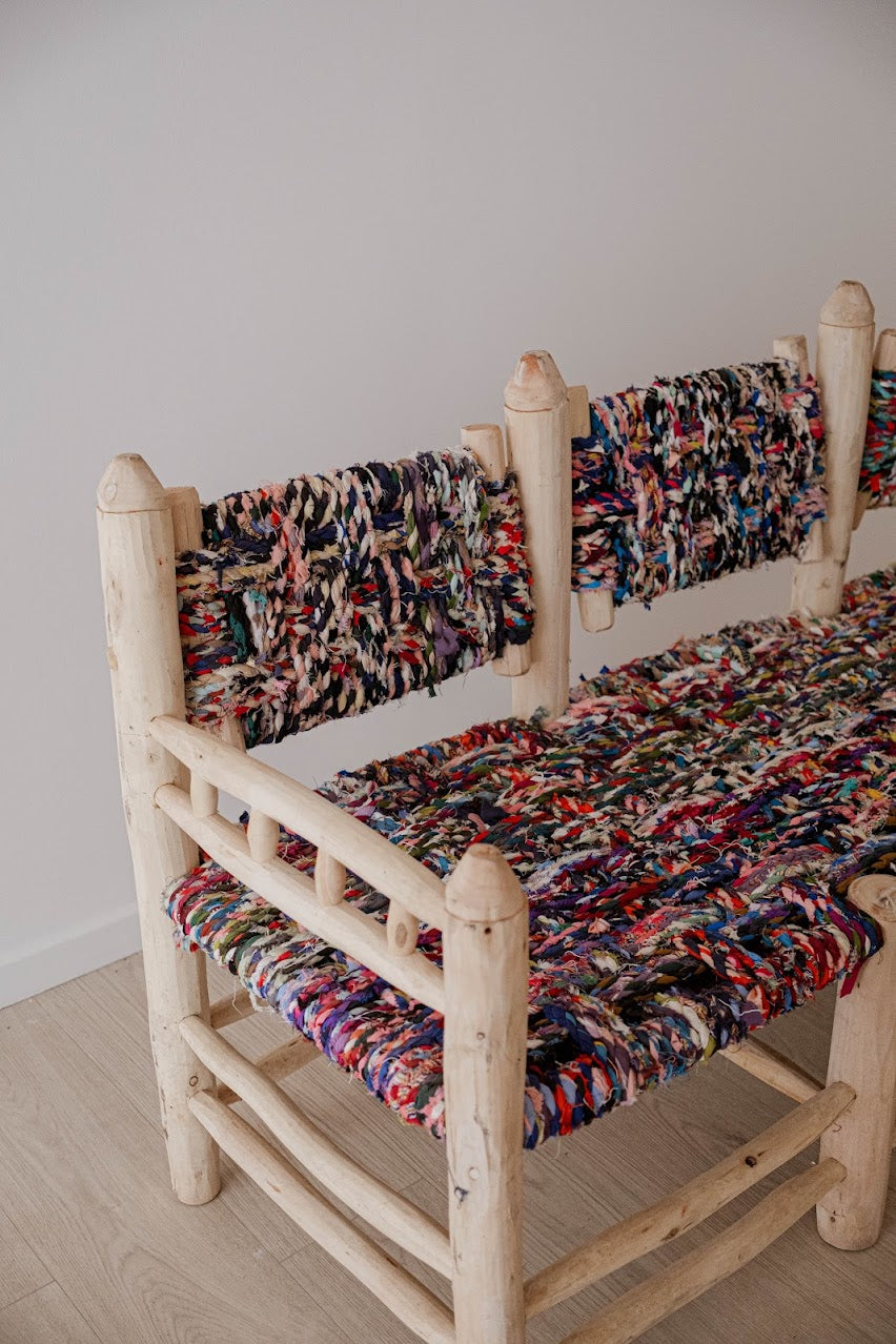 Ce banc artisanal en bois offre un charme authentique et chaleureux. Sa structure en bois brut, sculptée avec simplicité, met en valeur une assise et un dossier tissés à la main à partir de tissus recyclés et colorés. Chaque bande de tissu crée une texture unique et vibrante, faisant de ce meuble une pièce véritablement singulière.
