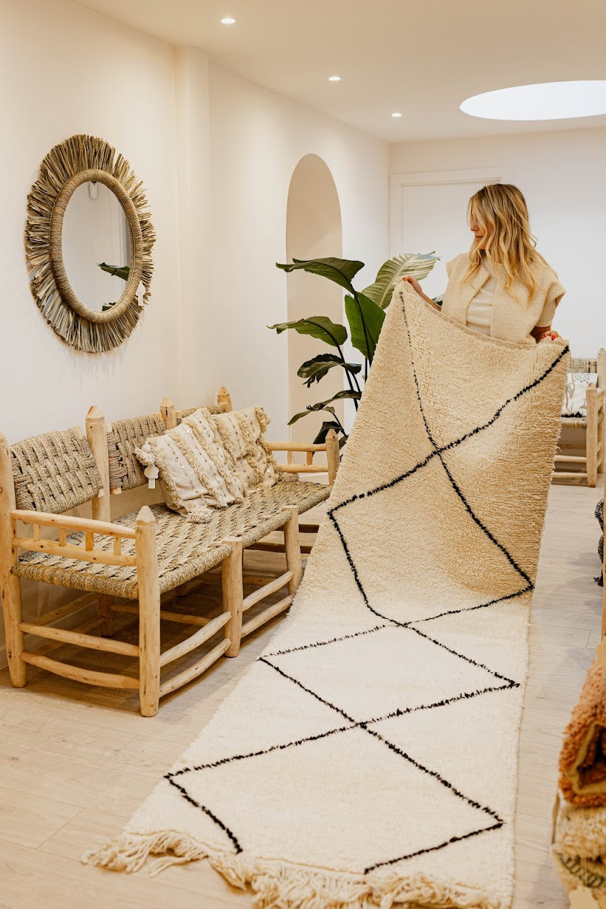 Le tapis berbère fait main en laine incarne l'authenticité et le savoir-faire ancestral des artisans marocains. Tissé avec soin, chaque tapis est unique et présente des motifs délicats, comme les petites touches de laine noire sur le fond clair, qui ajoutent du caractère à l'ensemble. Fabriqué en laine naturelle de haute qualité, il offre une douceur incomparable et une grande durabilité, tout en étant un élément décoratif remarquable pour n'importe quelle pièce.
